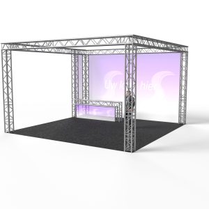 Kortom, beursstand C met het eigen logo op het standdoek en aan de zijkant, te huren bij Ultrasound, is de perfecte keuze voor bedrijven die willen opvallen en indruk willen maken op beurzen en evenementen. Met zijn combinatie van opvallend design, hoogwaardige materialen is het de ideale stand voor elk merk of bedrijf.